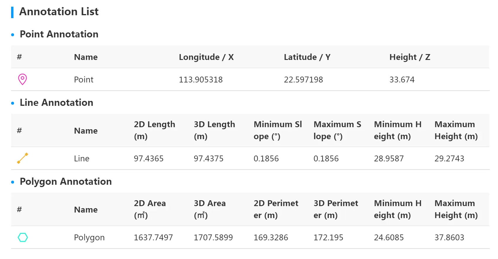 تسرد التعليقات التوضيحية للنقاط والخطوط والمضلعات ومعلوماتها التفصيلية في شكل جدول.