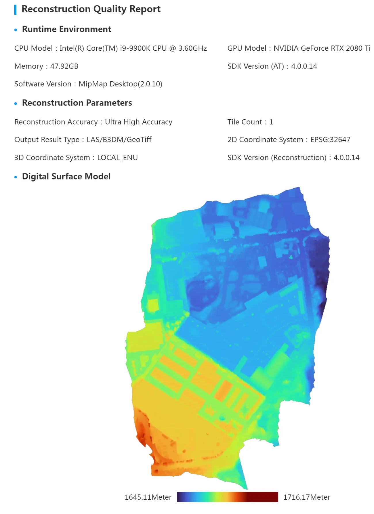 Mainly includes the environment in which the task was executed, reconstruction parameters, and an overview of the generated DSM. If the task only generated 3D results, there will be no DSM results.
