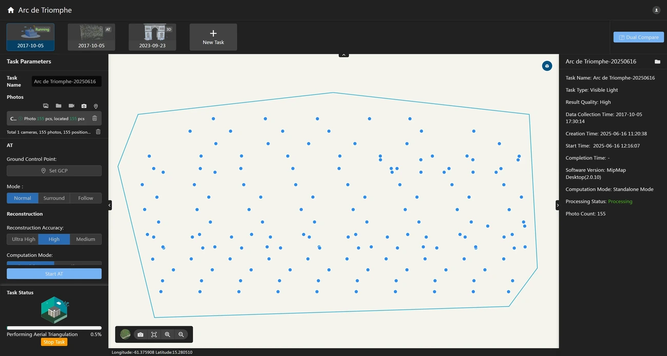 After the aerial triangulation task is completed, the aerial triangulation point cloud will be automatically displayed. You can click the button on the aerial triangulation page to show/hide camera poses.