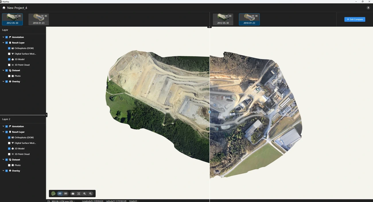 When there are multiple tasks under a project, the "Dual Screen Comparison" button in the upper right corner of the software will be activated. Click "Dual Screen Comparison" and the map will enter the comparison state.