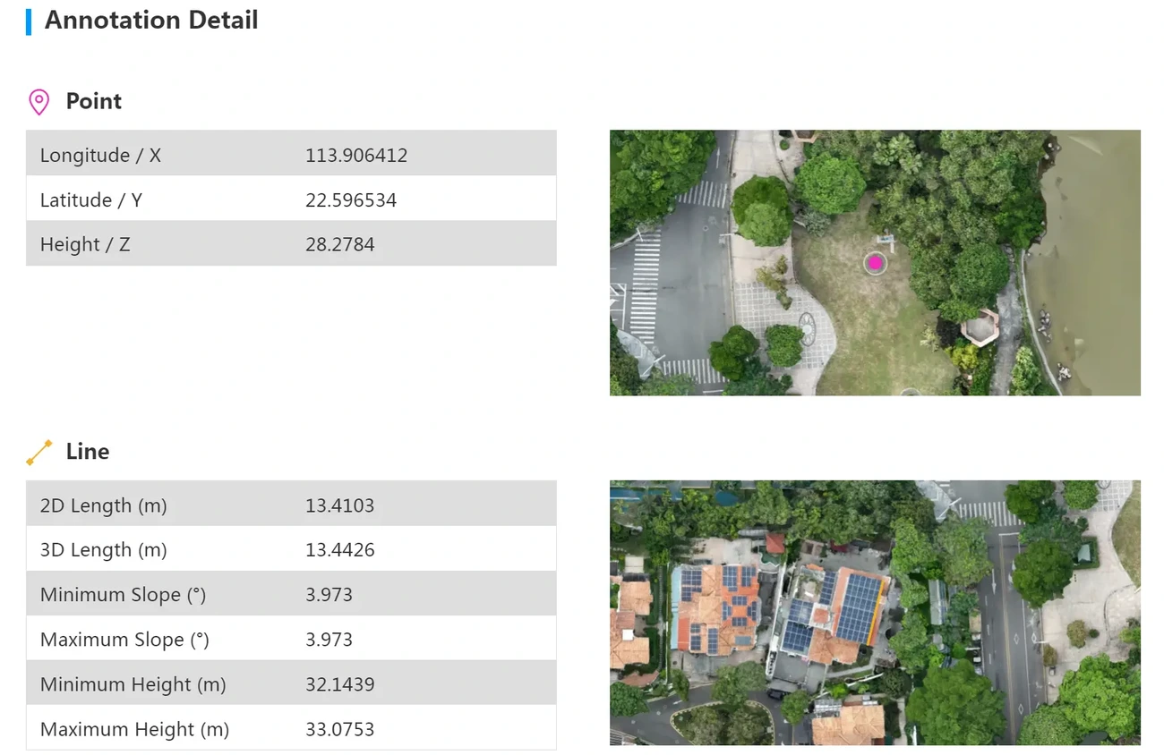 تسرد التعليقات التوضيحية للنقاط والخطوط والمضلعات ومعلوماتها التفصيلية في شكل جدول.