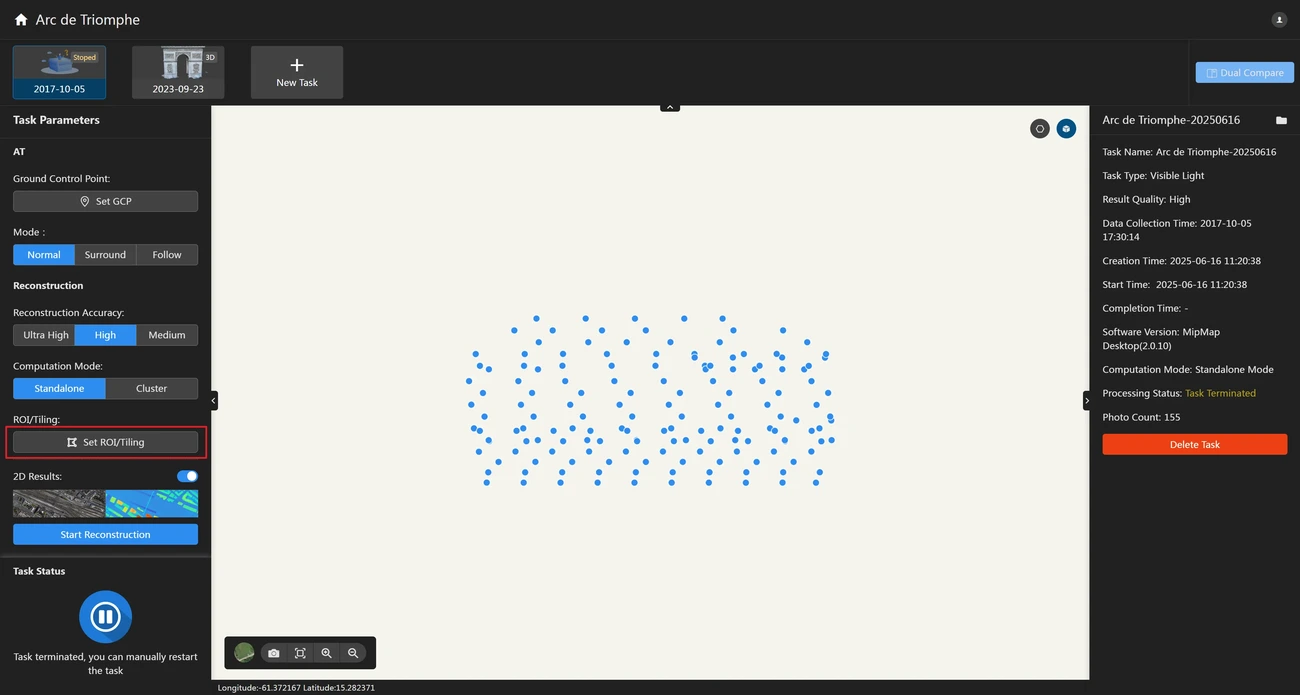 Unter normalen Umständen wird der Datensammlunsbereich den Ziel-Interessensbereich überschreiten. Insbesondere in Szenarien mit Umgebungsfotografie einzelner Gebäude wie Häuser werden die rekonstruierten Bilddaten einen Hintergrund enthalten, der viel größer ist als das einzelne Gebäude. Rekonstruktion in diesen Szenarien verschwendet erhebliche Rechen- und Speicherressourcen. Diese Software bietet Benutzern eine voreingestellte Interessensbereich-Funktion vor jeder Datenverarbeitung, die eine Rekonstruktionsbereichsbegrenzung durch externen Bereichsdatei-Import oder manuelle Bearbeitung ermöglicht.