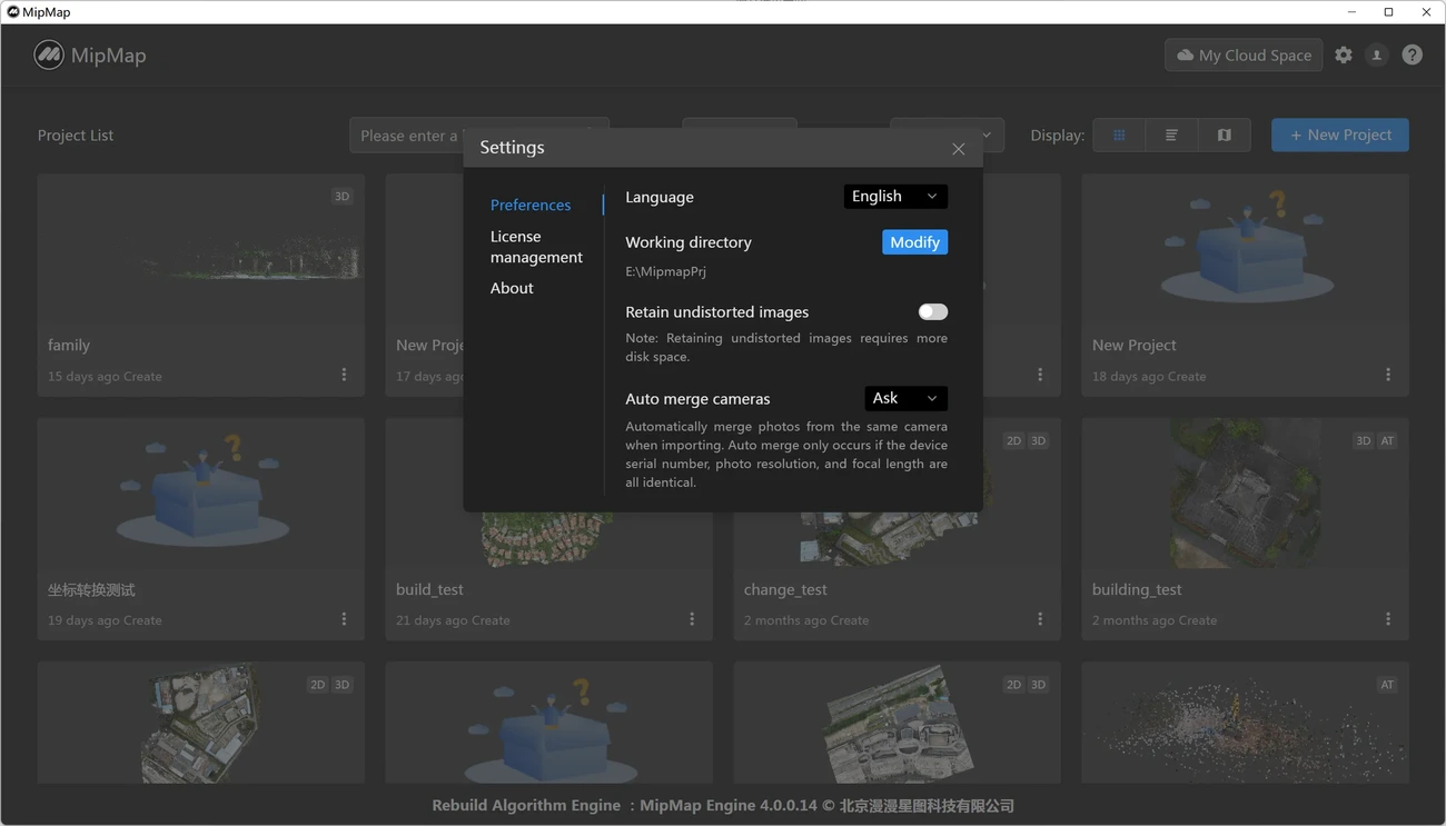 Tenga en cuenta que el <Directorio de Trabajo> del software por defecto es "C:\Users\Administrator\Documents\mipmap-desktop". El <Directorio de Trabajo> se utiliza para almacenar archivos intermedios durante el modelado del proyecto y las salidas del modelo final, lo que ocupará un espacio significativo en el disco. Para usuarios que procesan datos a gran escala, se recomienda configurar el <Directorio de Trabajo> en un disco con mayor espacio libre después del primer inicio de sesión. Usar un disco SSD proporciona la mejor experiencia de rendimiento. Otras configuraciones pueden personalizarse según sus necesidades.
