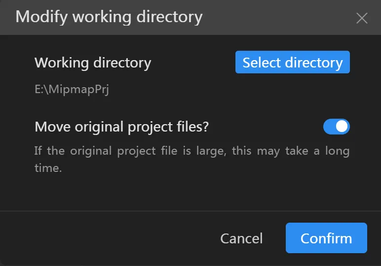 Antes de modificar el directorio de trabajo, necesita elegir si mover los archivos del proyecto original. Si está marcado, los archivos del directorio de trabajo actual se moverán al nuevo directorio de trabajo. Esto puede tomar mucho tiempo si los archivos son grandes.