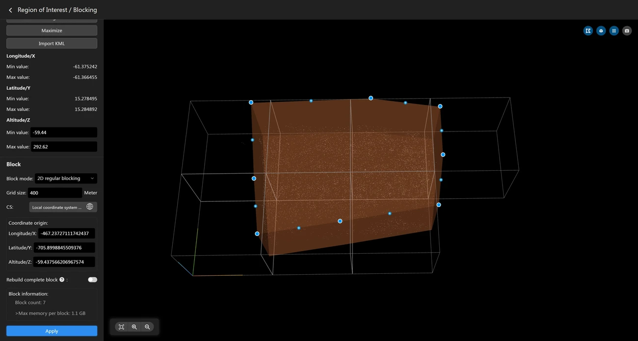- Modo de Bloque El software soporta 3 modos de bloque: Bloqueo Regular 2D: Ignora la información de altura del área de reconstrucción y realiza bloqueo regular solo en el plano XY según la grilla especificada y sistema de coordenadas. Bloqueo Regular 3D: Considera la altura del área de reconstrucción y realiza bloqueo regular en las direcciones X, Y y Z según la grilla especificada y sistema de coordenadas. Bloqueo por Memoria: Realiza bloqueo adaptativo especificando la memoria máxima ocupada por cada bloque.