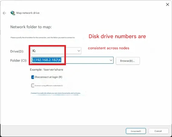 - Mappez le disque partagé sur un lecteur réseau, afin que tous les nœuds puissent y accéder via une lettre de lecteur, comme pour accéder à un disque local.