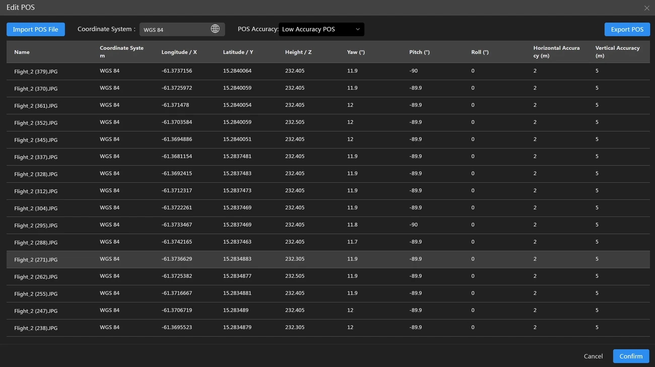 Différents dispositifs d'acquisition d'images peuvent fournir des données POS (Système de Positionnement et d'Orientation) dans différents formats et avec des paramètres variables. Le logiciel fournit aux utilisateurs des fonctions correspondantes pour éditer les données POS.