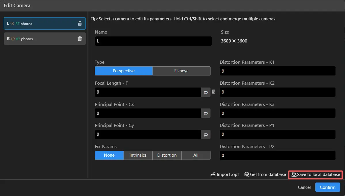 設定したカメラパラメータはローカルデータベースに保存をクリックして保存できます。
