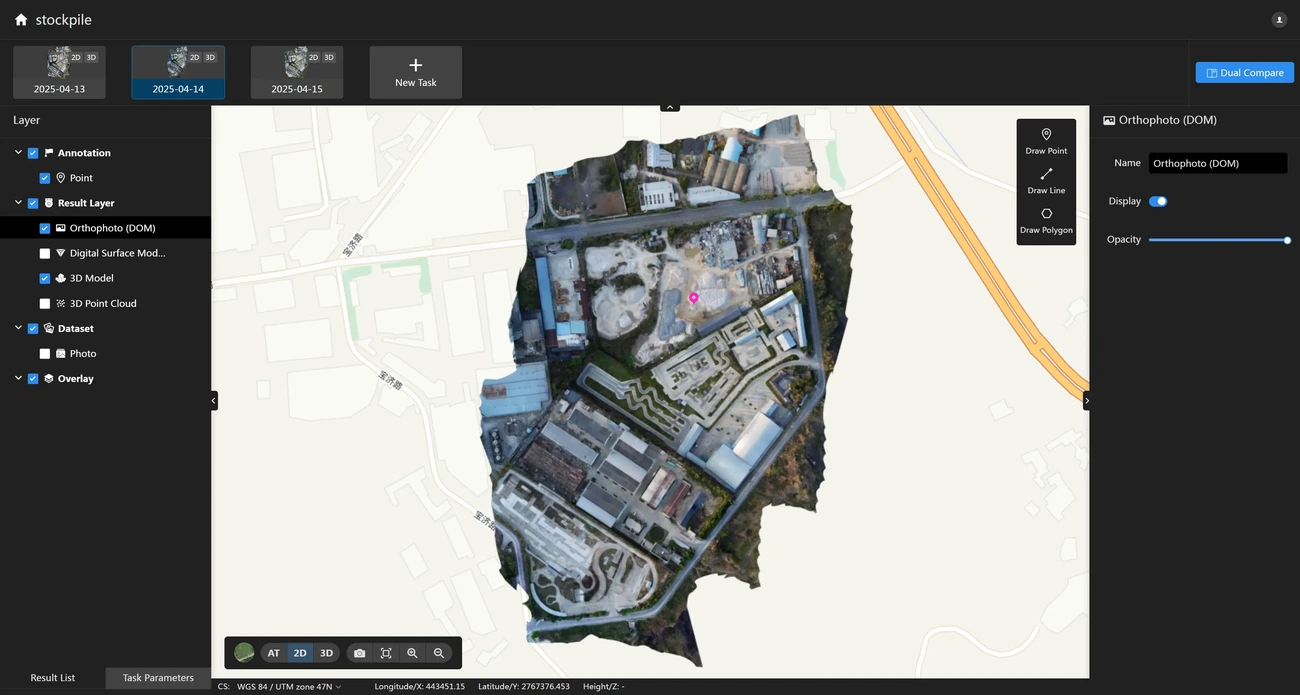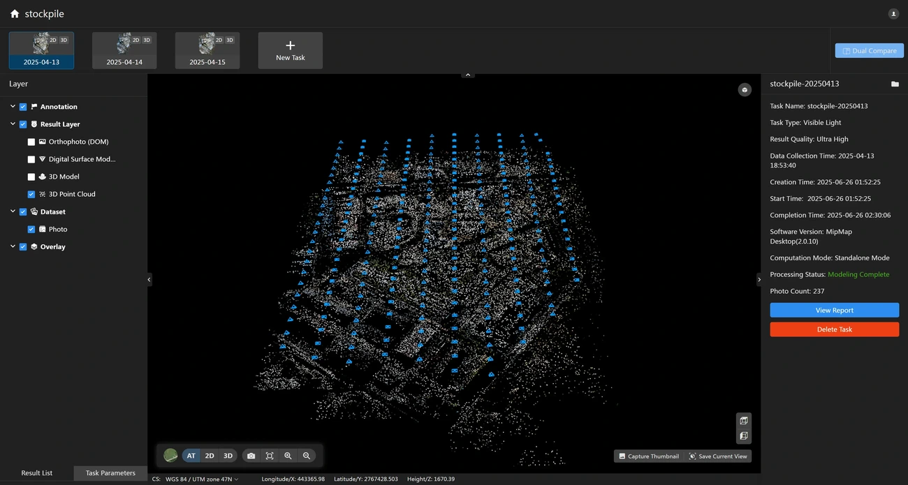 再構築が完了した後、ソフトウェアは自動的に再構築結果を表示します。左側にはこのタスクの結果レイヤーが表示されます。レイヤー前の「チェックボックス」をクリックして異なるレイヤーの表示を切り替えます。マップ下の「2D/3D」切り替えボタンをクリックして2Dと3D結果の表示を切り替えます。