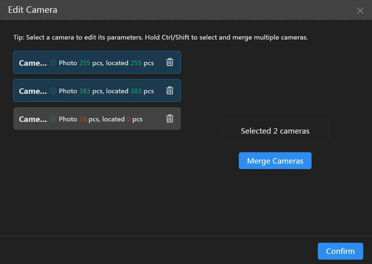 ソフトウェアは通常、フォルダごとに写真をカメラにグループ化します。ただし、複数のフォルダの写真が同じカメラに属する場合があります。この場合、(Ctrl + 左マウスボタン、Shift + 左マウスボタン)で統合が必要なカメラを選択し、 をクリックできます。選択されたグループは同じカメラグループに統合されます。