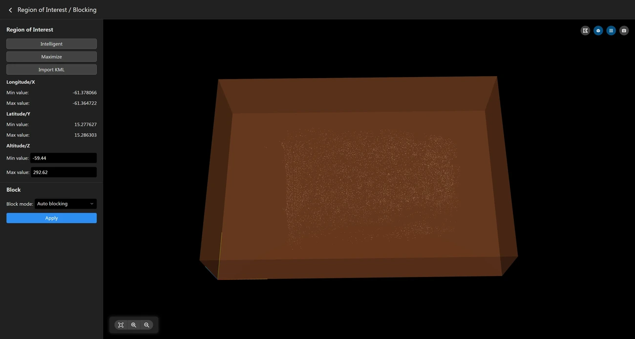 関心領域の事前設定に加えて、ソフトウェアは空中三角測量完了後の結果に基づいて、より正確な関心領域の設定もサポートしています。「関心領域/ブロック設定」ボタンをクリックして、ROIとカスタムブロック設定ページに入ります。