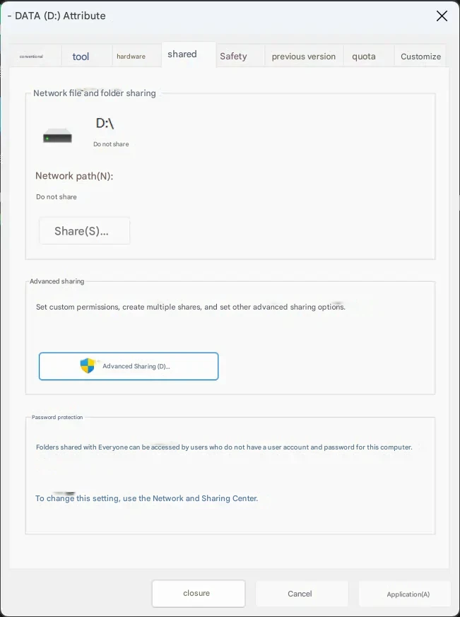 "이미지 저장 디스크(이미지를 저장하는 디스크)"와 "결과 저장 디스크(MipMap Disptok의 작업 디렉토리)"를 마우스 오른쪽 버튼으로 클릭하고 속성 대화 상자를 열고 속성 대화 상자에서 "공유" 탭을 엽니다.