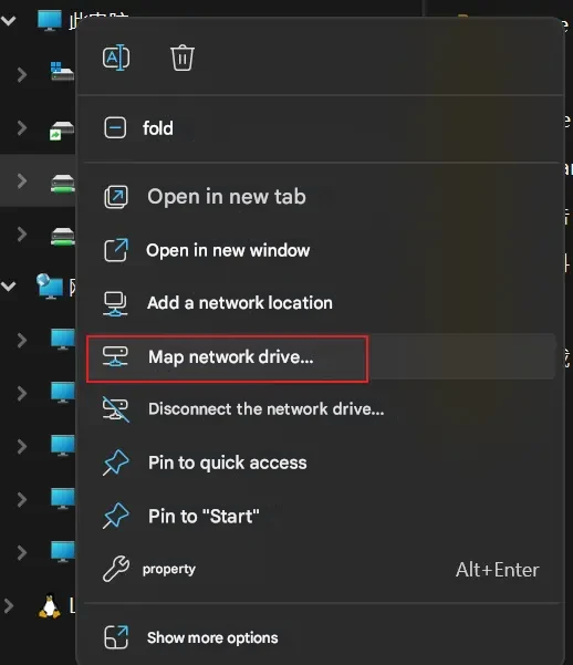 참고: 네트워크 드라이브를 매핑하여 클러스터를 구성할 때 "공유 디스크 설정" 전에 "이미지 저장 디스크"와 "결과 저장 디스크"를 미리 계획해야 합니다. 각 디스크의 드라이브 문자(디스크 드라이브 문자는 Windows "디스크 관리"에서 수정할 수 있음)가 모든 노드에서 일치하고 각 노드의 다른 디스크 드라이브 문자와 충돌하지 않는지 확인합니다. 예: "이미지 저장 디스크"가 자식 노드 1에서 디스크 "Z"인 경우 다른 노드에는 디스크 "Z"가 없어야 하며 이 "이미지 저장 디스크"는 다른 모든 자식 노드에서 네트워크 디스크 "Z"로 매핑되어야 합니다. 마찬가지로 "결과 저장 디스크" 및 기타 액세스되는 디스크의 구성도 이 규칙을 따라야 합니다. 위 단계 후 자식 노드는 이미 공유 디스크를 정상적으로 읽고 쓸 수 있습니다. 네트워크 경로를 사용하는 경우 이 단계를 건너뛸 수 있습니다. "내 PC"를 마우스 오른쪽 버튼으로 클릭하고 "네트워크 드라이브 매핑"을 선택합니다.
