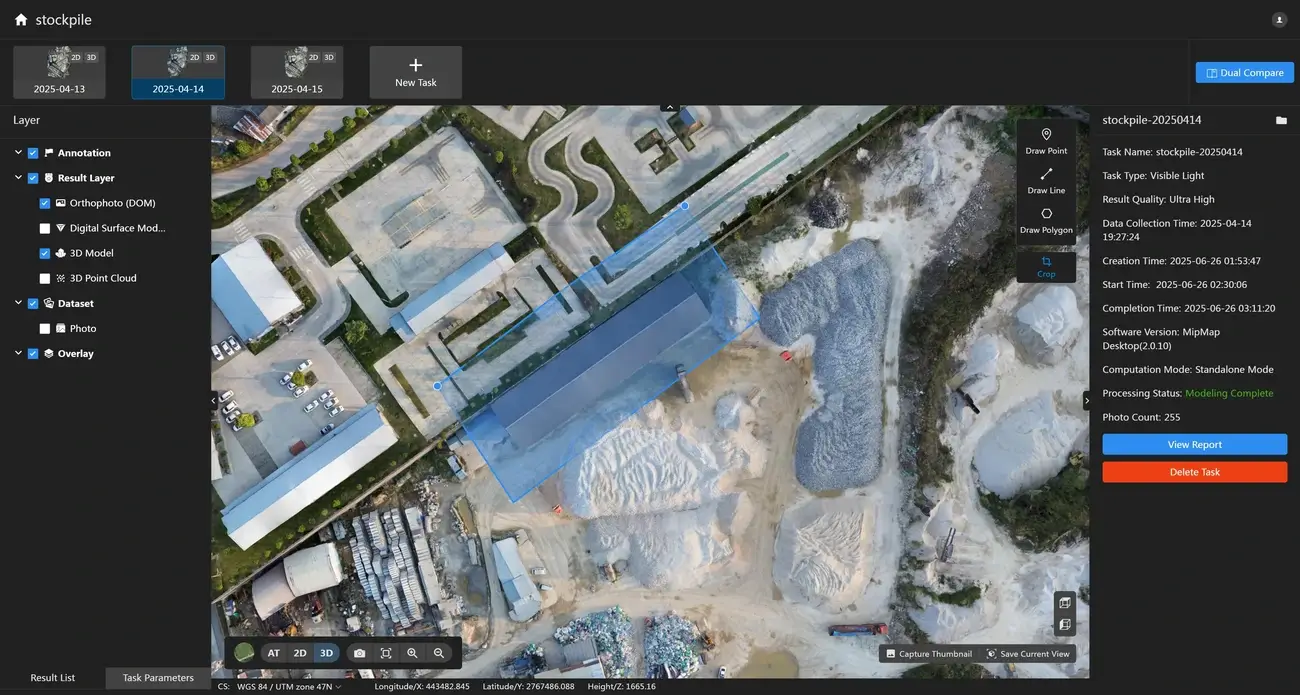 재구성이 완료된 후, 소프트웨어는 자동으로 재구성 결과를 표시합니다. 왼쪽에는 이 작업의 결과 레이어가 표시됩니다. 레이어 앞의 "체크박스"를 클릭하여 다른 레이어의 표시를 전환할 수 있습니다. 지도 아래의 "2D/3D" 전환 버튼을 클릭하여 2D와 3D 결과 표시를 전환할 수 있습니다.