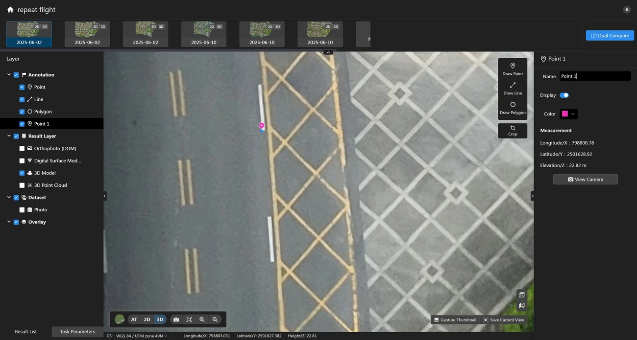 Você pode criar anotações no mapa usando os botões de anotação no canto superior direito do mapa para medir as informações espaciais do mapa. Atualmente, suporta a criação de três tipos de anotações: pontos, linhas e polígonos. Deve-se notar que apenas dados contendo informações de localização podem ser usados para criar anotações. Se as fotos não contiverem informações de localização, você só poderá visualizar o modelo 3D e não poderá realizar medições.