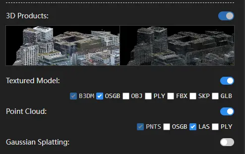 No painel de parâmetros da tarefa à esquerda, na seção Resultados 3D, é possível selecionar os produtos de saída da reconstrução e os formatos correspondentes.