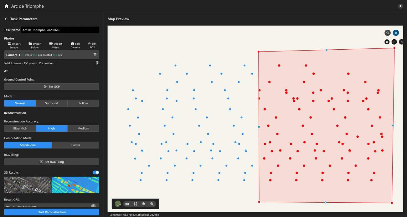 Após importar as fotos, o software definirá automaticamente os parâmetros de reconstrução padrão com base nos dados da foto analisados. Você também pode modificar manualmente os parâmetros de reconstrução que desejar.