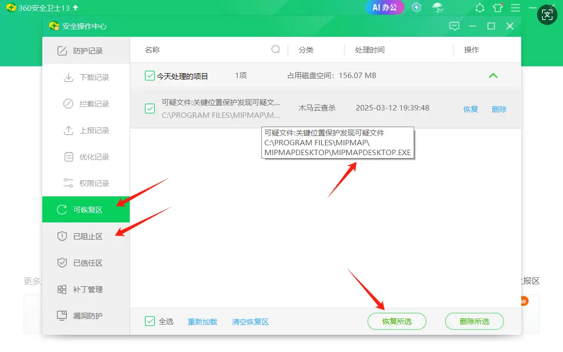 (2) В разделах Карантин и Заблокированные найдите файлы в карантине с "mipmap" в их именах, такие как mipmap_desktop.exe, показанный на рисунке ниже. Еще один распространенный — mipmap_engine.dll. Выберите файл и нажмите Восстановить выбранные