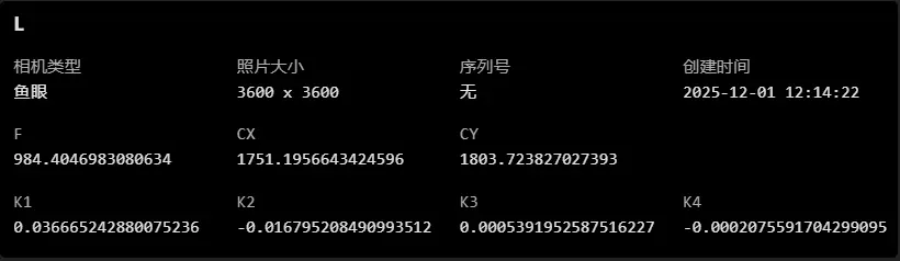 - Параметры камеры (для данных LiDAR обычно используется камера «рыбий глаз»). Требуемые параметры: фокусное расстояние, главная точка XY, K1, K2, K3, K4.