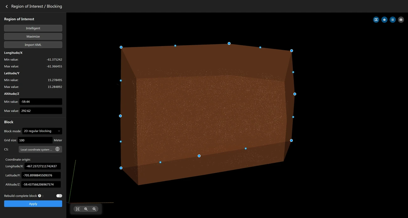 - Установка системы координат блока Система координат блока по умолчанию - это система координат LocalENU с началом в правом нижнем углу максимизированной области интереса. Если вам нужно настроить систему координат блока, вы можете выбрать систему координат и начало координат в панели настроек блока. Эта система координат служит только как начало для блокировки и не влияет на систему координат результатов реконструкции. Если вам нужно установить систему координат для выходных результатов, пожалуйста, сделайте это в панели параметров результатов реконструкции.