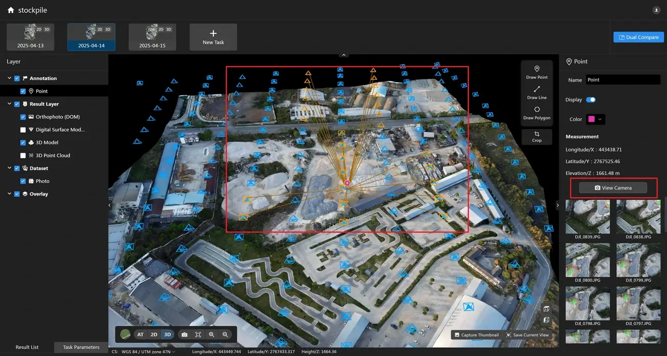 Bir nokta açıklaması oluşturduktan sonra, nokta açıklaması aracılığıyla bu noktayı içeren fotoğrafları görüntüleyebilir ve kamera konumunu gösterebilirsiniz. O noktayı içeren fotoğrafların listesini görüntülemek için nokta açıklaması arayüzündeki düğmesini tıklayın. Modeldeki fotoğraf listesine karşılık gelen kameralar sarı renkte görüntülenir ve seçili fotoğrafa karşılık gelen kamera kırmızı renkte görüntülenir.