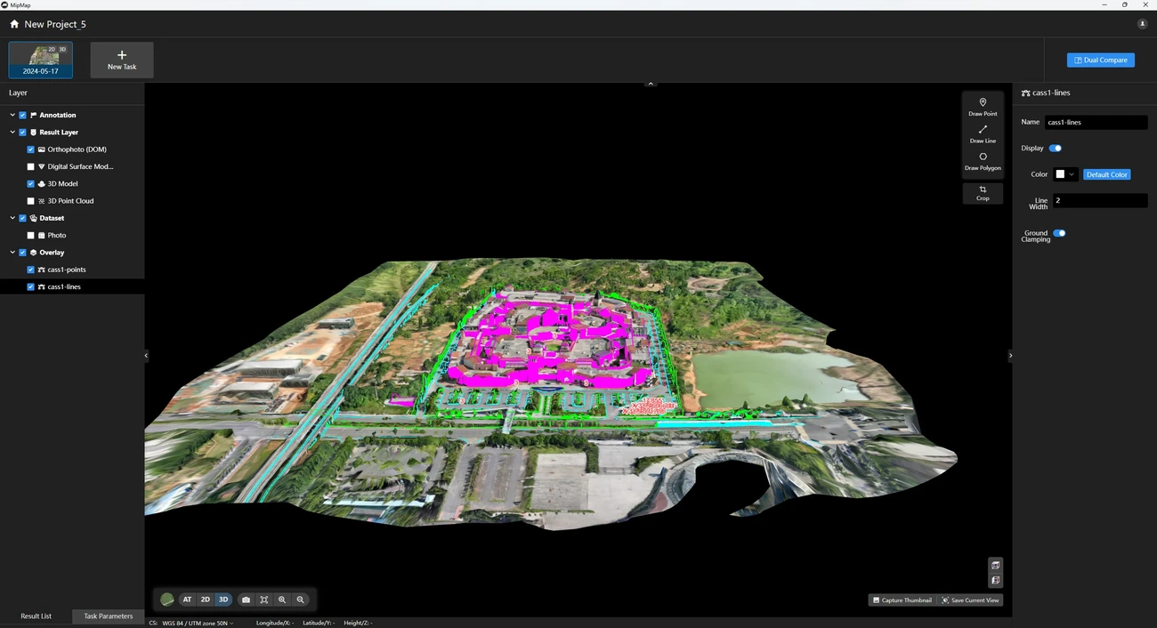 Kaplamaları içe aktardıktan sonra çizgi çizimi ortofoto ve model üzerinde görüntülenecektir. Sol taraftaki kaplama çubuğu veya sağ taraftaki görüntü düğmesi