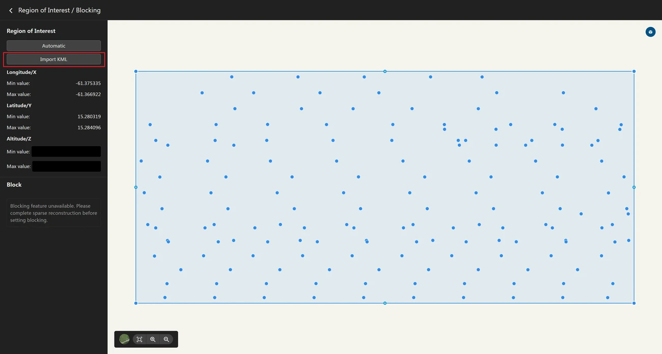 İHA veri toplama platformları için, kullanıcılar genellikle veri toplama aralığını uçuş kontrol yazılımında veya Google Earth'te çizerler. Bu aralık KML formatında dışa aktarılabilir ve bu yazılım için ilgi alanı aralığı olarak kullanılabilir. İlgi alanı düzenleme panelinin sol üst köşesindeki KML'yi İçe Aktar düğmesine tıklayın, dosya seçme iletişim kutusunu açın, içe aktarılacak KML dosyasını seçin ve ilgi alanı düzenleme panelinin sağ tarafında aralığı görüntülenecektir.