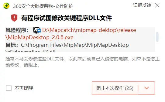 | 3 | 杀毒软件拦截安装:![]() | 是软件未签名的问题,官方渠道下载的软件本身不会携带任何病毒 | 从官网下载的软件,可以放心点击允许操作,不让杀毒软件拦截。 官网下载地址:https://www.mipmap3d.com/download |