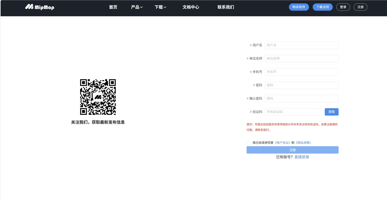 用户第一次使用时,可以点击<立即注册>按钮,进入MipMap账号注册界面,通过手机号进行注册。