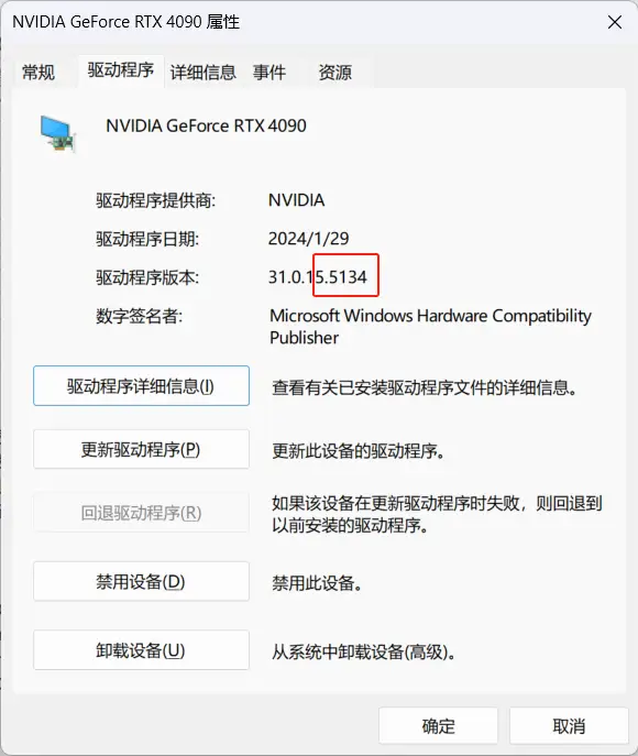 | 根据上述配置要求确定重建电脑后,在软件安装前,建议先检查电脑GPU驱动,确保计算机安装好满足版本要求的英伟达显卡驱动。检查驱动时,可通过<设备管理器>-<显示适配器>中找到英伟达显卡(如NVIDIA GeForce RTX 4090),双击后切换到<驱动程序>子页,查看驱动程序版本的后5位,如下图所示,5.5134则表示驱动版本为551.34。显卡驱动版本的最低要求为528.33。 |