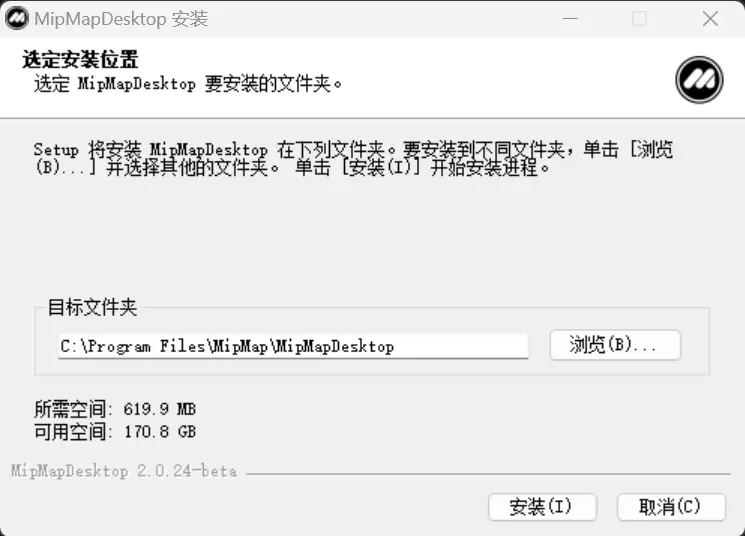 双击软件安装包(MipMap Desktop.exe),根据需求选择安装对象后,点击下一步,选择安装目录,点击安装即可完成MipMap Desktop安装。