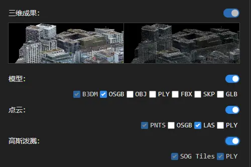 可在左侧任务参数界面三维成果中,设置勾选需要的重建输出成果及相应格式。