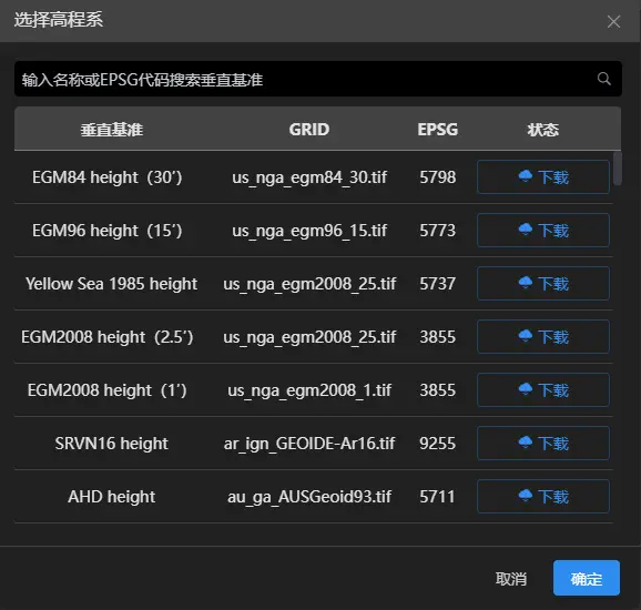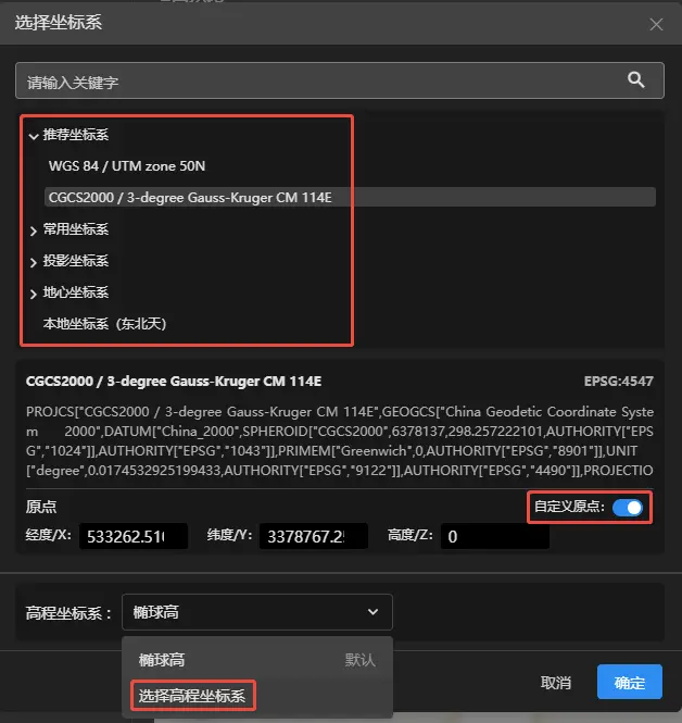 可设置水平坐标系和高程坐标系,可勾选设置自定义原点,设置完成后点击确定。
