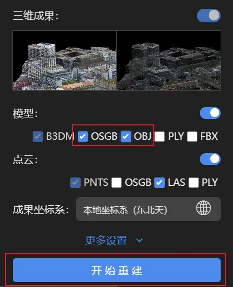 三维成果在重建完成后支持添加格式,在第一次重建成果基础上续建得到新的成果格式,如第一次重建只勾选了OSGB格式,重建完成后继续勾选OBJ格式,点击开始重建,经过快速续建后得到OBJ格式成果。