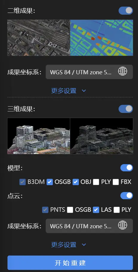 二三维成果在重建完成后支持修改成果坐标系,在第一次重建成果基础上续建得到位于修改后坐标系的成果,如第一次重建选择本地坐标系(东北天),重建完成后修改为WGS 84 / UTM zone 50N坐标系,点击开始重建,经过快速续建后得到位于WGS 84 / UTM zone 50N坐标系的成果。