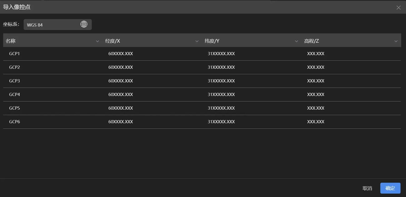 点击像控点列表面板右上角的"导入控制点"按钮,选择控制点文件导入,支持csv、txt等格式,软件会自动识别分隔符。在控制点导入对话框设置控制点的坐标系及高程系,选择控制点的名称和坐标字段,点击"确定"按钮确认导入。