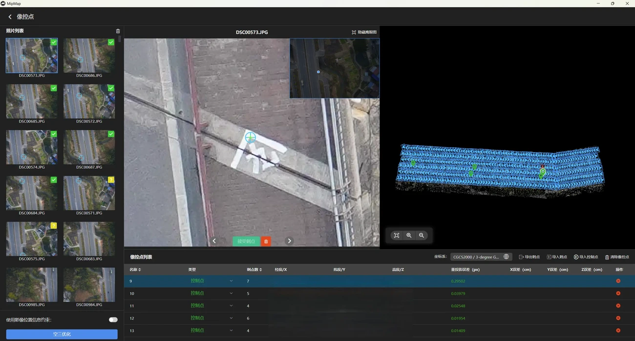控制点刺点完毕后点击照片列表下方的"空三优化"按钮执行空三优化,执行完成后,像控点会显示每个像控点的重投影误差和XYZ方向的中误差。