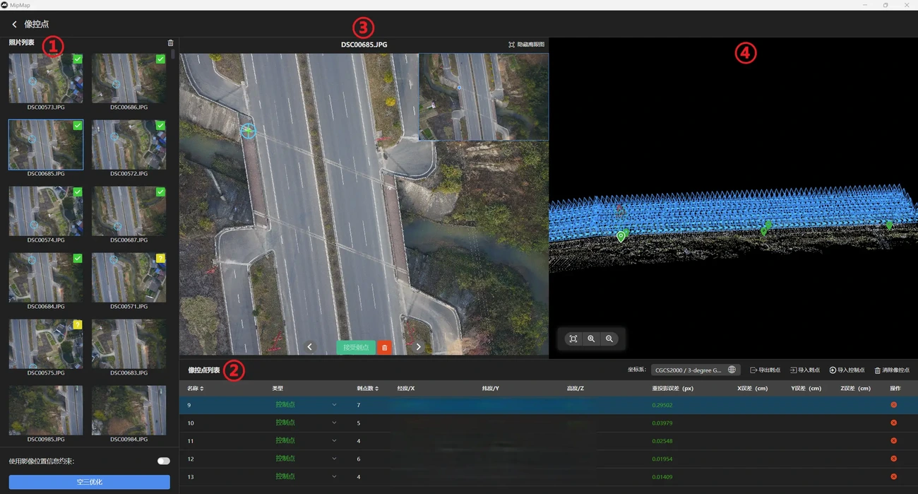 区域①为照片列表,当有选中的像控点时,照片列表会显示预测的点位以及刺点状态。 区域②为像控点列表,会显示像控点的坐标、刺点情况以及误差大小 区域③为照片预览面板,可以对照片进行缩放,点击可以对像控点进行刺点 区域④为地图面板,会显示空三成果、相机位姿、像控点的点位以及刺点情况