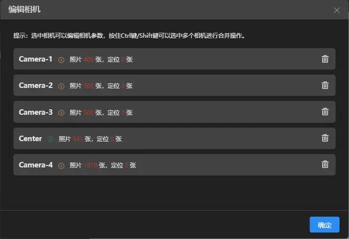 软件通常会通过文件夹对照片进行相机分组。但也存在多个文件夹照片属于同一相机的情况,此时可以(Ctrl+鼠标左键、Shift+鼠标左键)选中需要合并的相机,点击。所选中的组将合并为同一相机组。