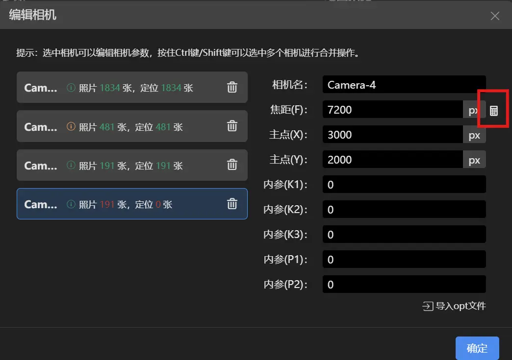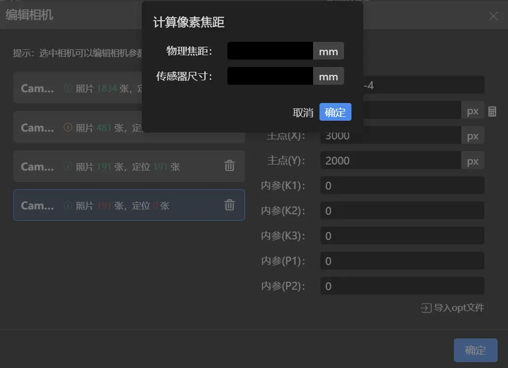 点击需要设置的相机,会在右侧显示该相机的参数。默认情况下这些参数是从照片中解析的。如果照片中没有解析到相关的参数,软件也会计算一个默认值。如果你有准确的相机参数,可以在这里修改,然后点击"确定"。 部分相机参数记录在opt格式文件中。软件支持导入opt文件读取并自动填写相机参数。