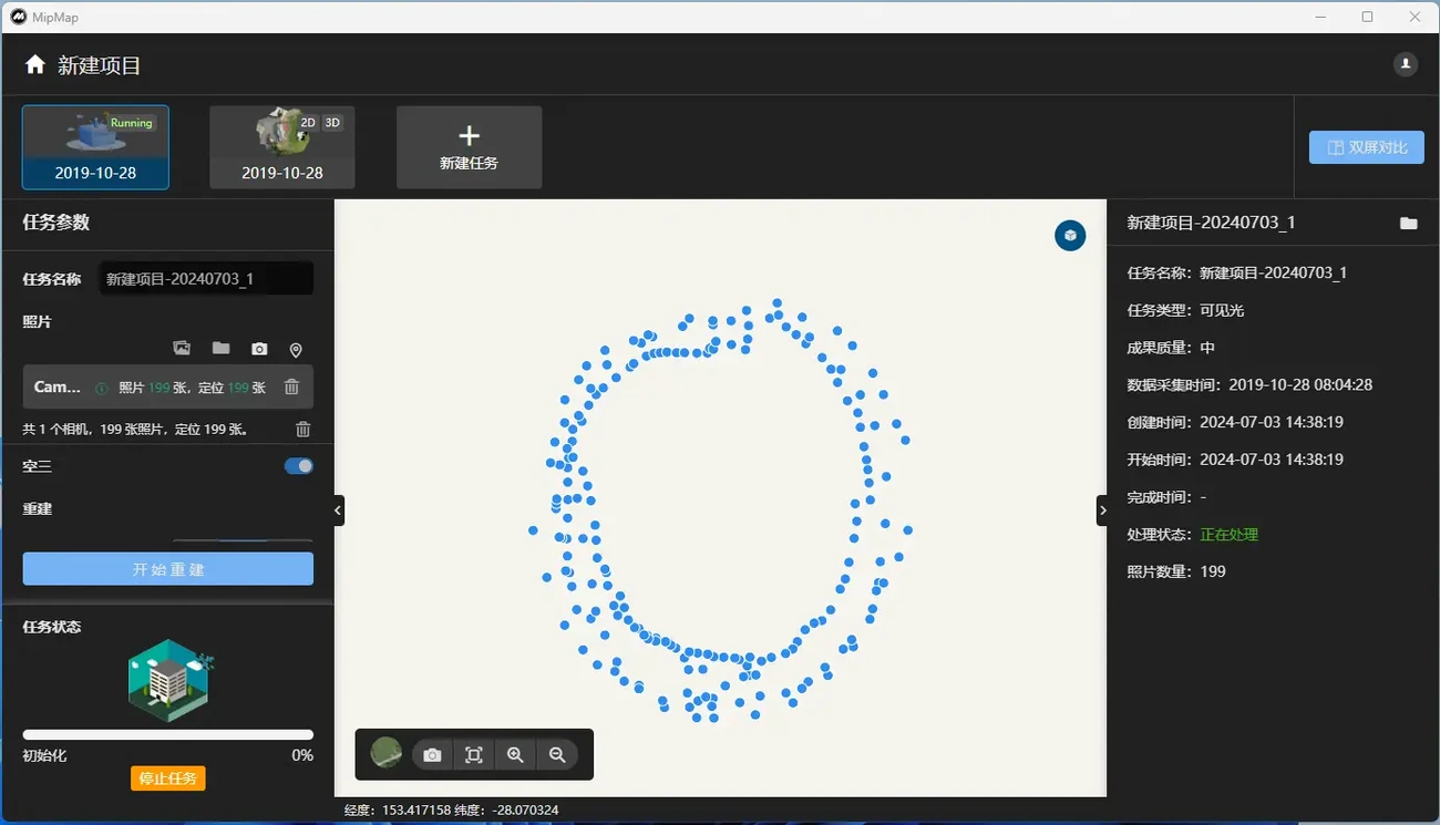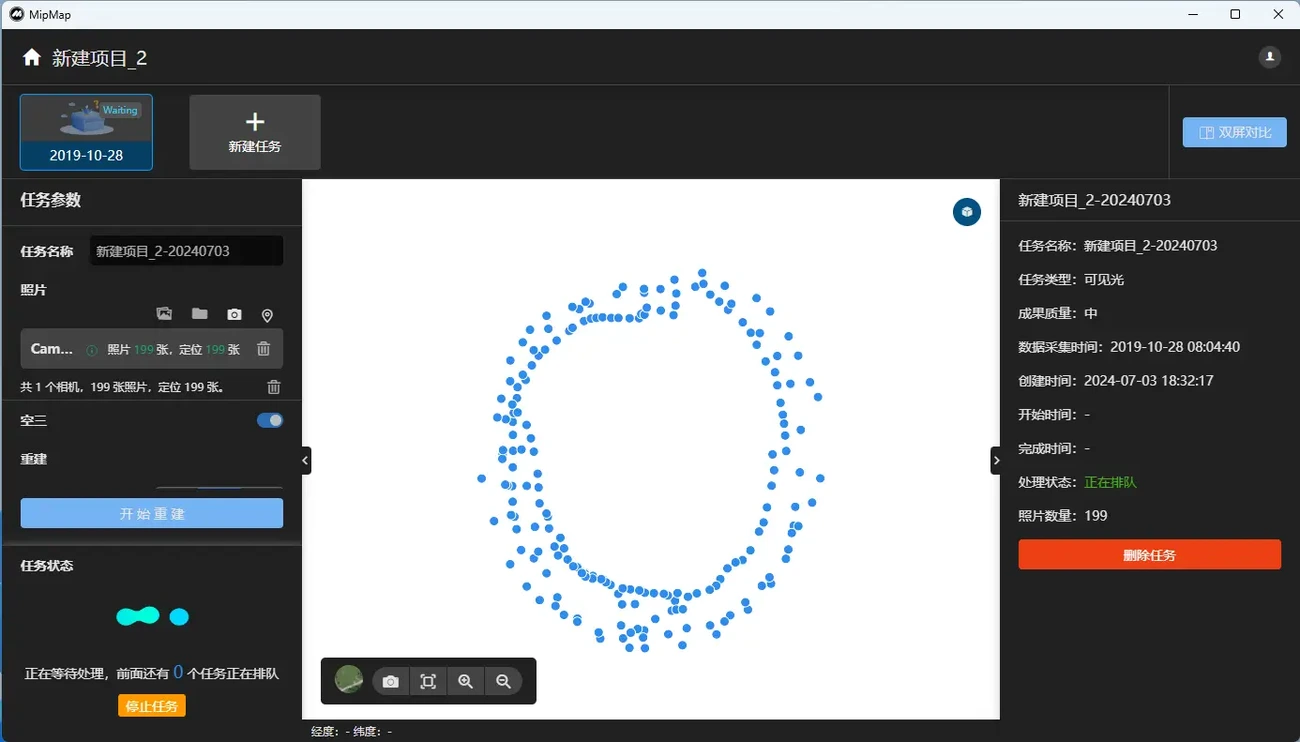 界面上会展示任务当前的处理进度,重建参数处于置灰的状态,不可更改。点击按钮可以终止该任务的处理。