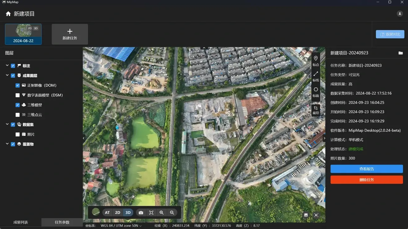 重建完成后会自动显示重建的成果,如果既有二维成果也有三维成果,可以点击地图页面左下角来切换2D和3D的显示的模式。左侧面板会显示成果列表,点击复选框可以切换不同的成果。