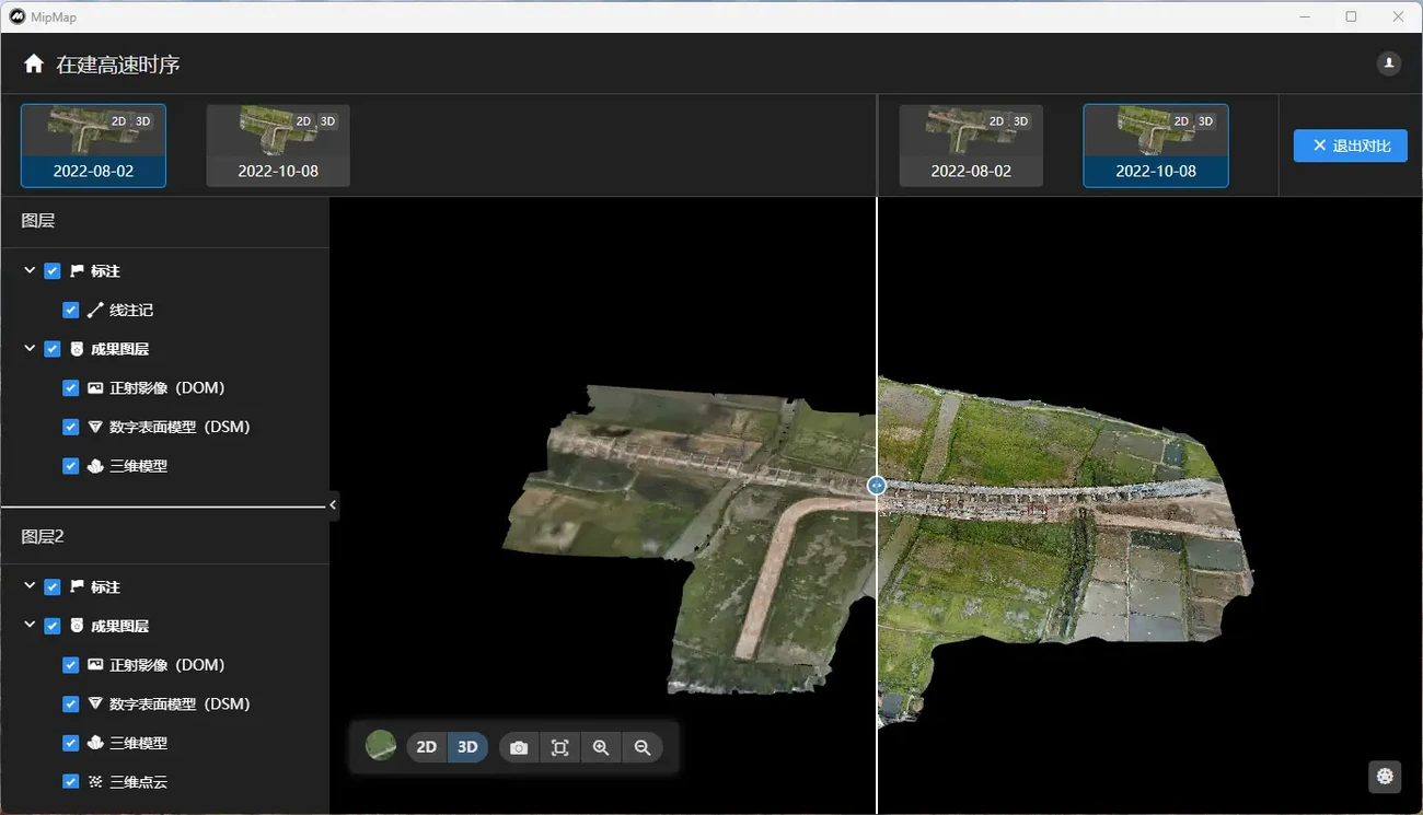 当一个项目下面有多个任务时,软件右上角的"双屏对比"按钮会呈现激活状态,点击"双屏对比",地图会进入对比状态。