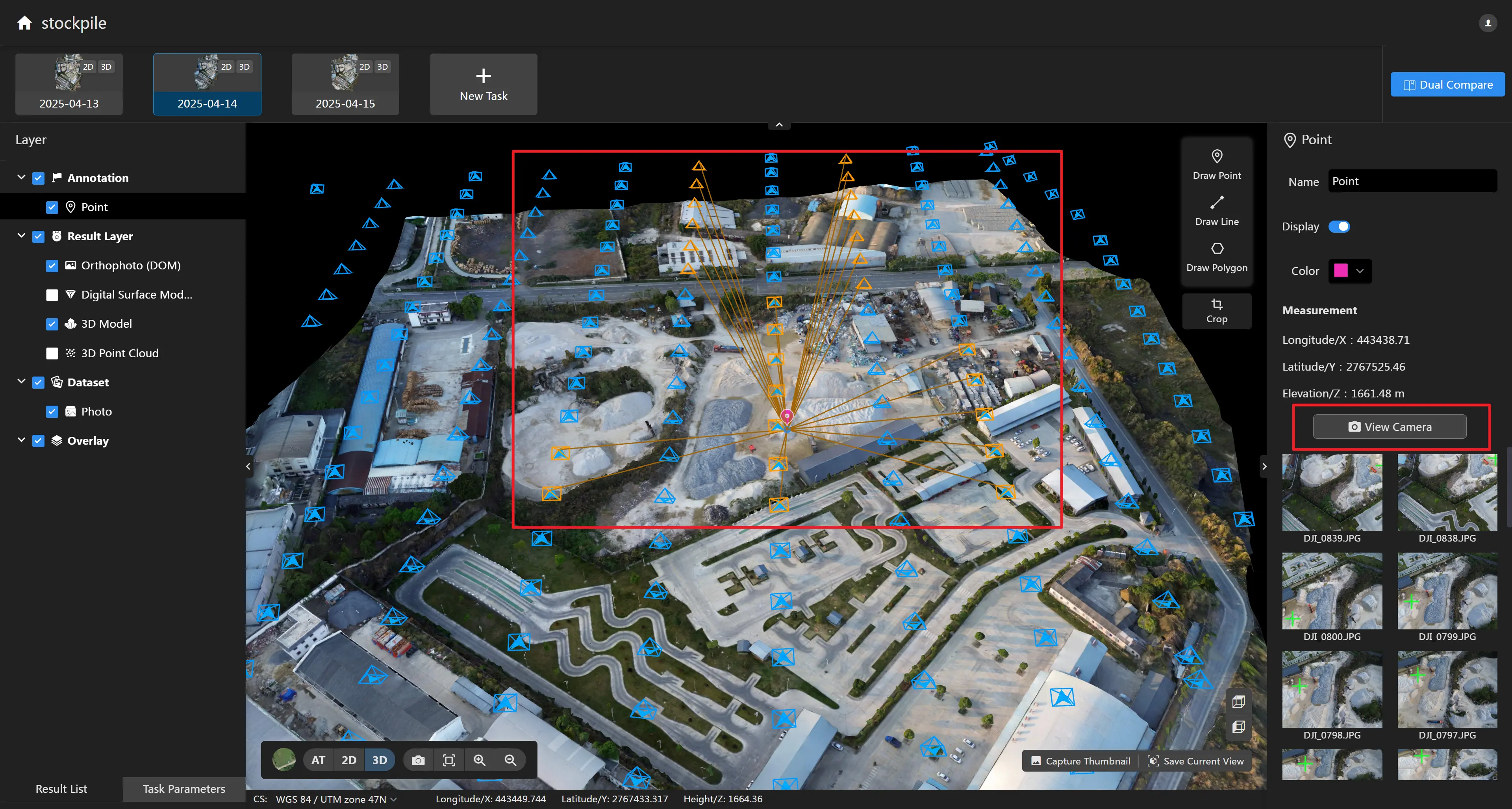 After creating a point annotation, you can view the photos containing this point through the point annotation and display the camera position. Click the button on the point annotation interface to display a list of photos containing that point. The cameras corresponding to the photo list on the model are displayed in yellow, and the camera corresponding to the selected photo is displayed in red.