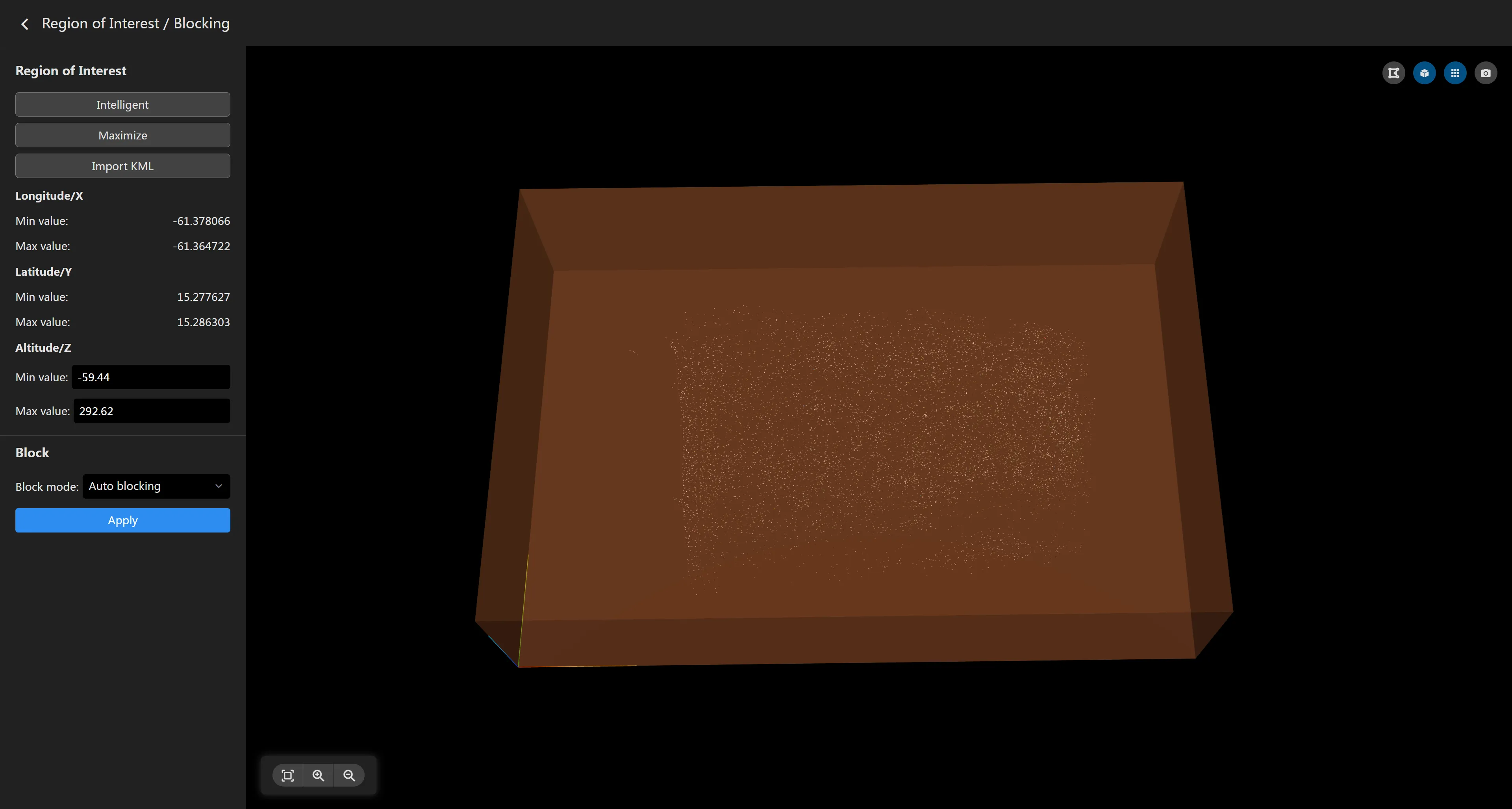 - Alternar Região de Interesse Se a região de interesse não foi definida antes da triangulação aérea, a região de interesse maximizada será usada por padrão para garantir que todas as nuvens de pontos estejam incluídas no intervalo de reconstrução. Você pode alternar entre diferentes regiões de interesse através do painel esquerdo. A região de interesse "Inteligente" é calculada de forma inteligente pelo software com base na distribuição da nuvem de pontos. Você também pode importar um arquivo KML para definir uma região de interesse personalizada.