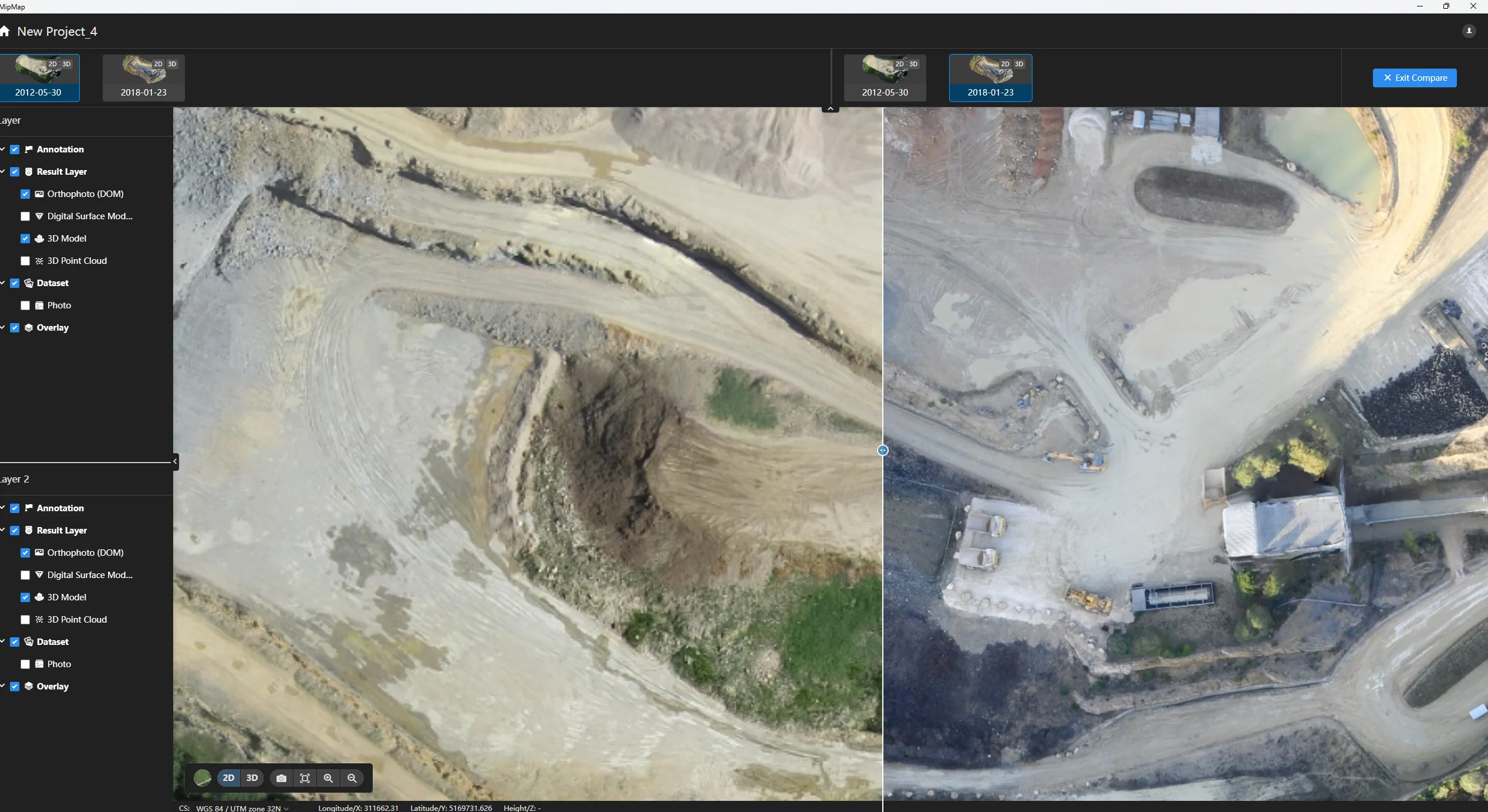 Quando houver várias tarefas em um projeto, o botão "Comparação em Tela Dupla" no canto superior direito do software será ativado. Clique em "Comparação em Tela Dupla" e o mapa entrará no estado de comparação.