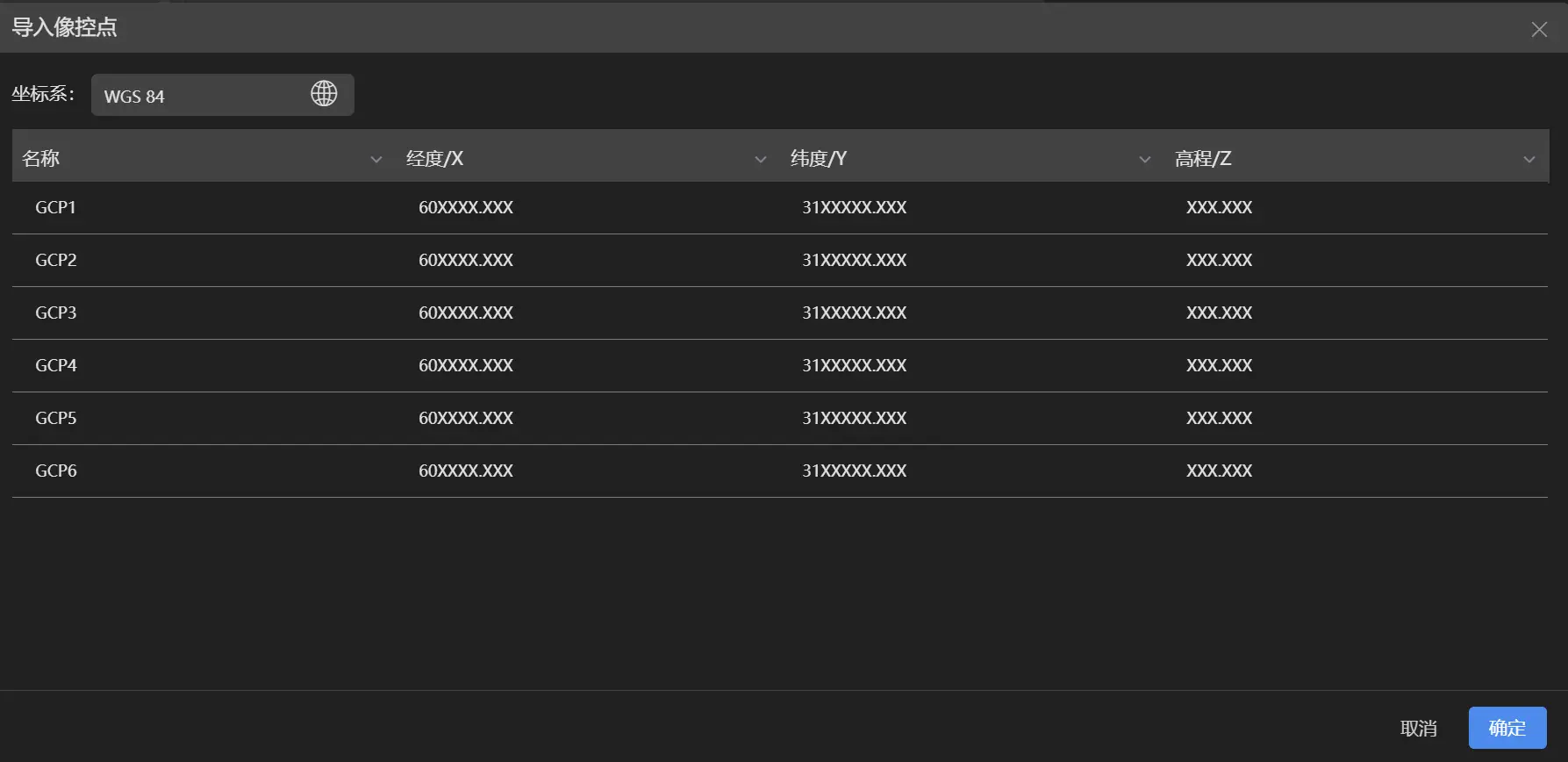 点击像控点列表面板右上角的"导入控制点"按钮,选择控制点文件导入,支持csv、txt等格式,软件会自动识别分隔符。在控制点导入对话框设置控制点的坐标系及高程系,选择控制点的名称和坐标字段,点击"确定"按钮确认导入。