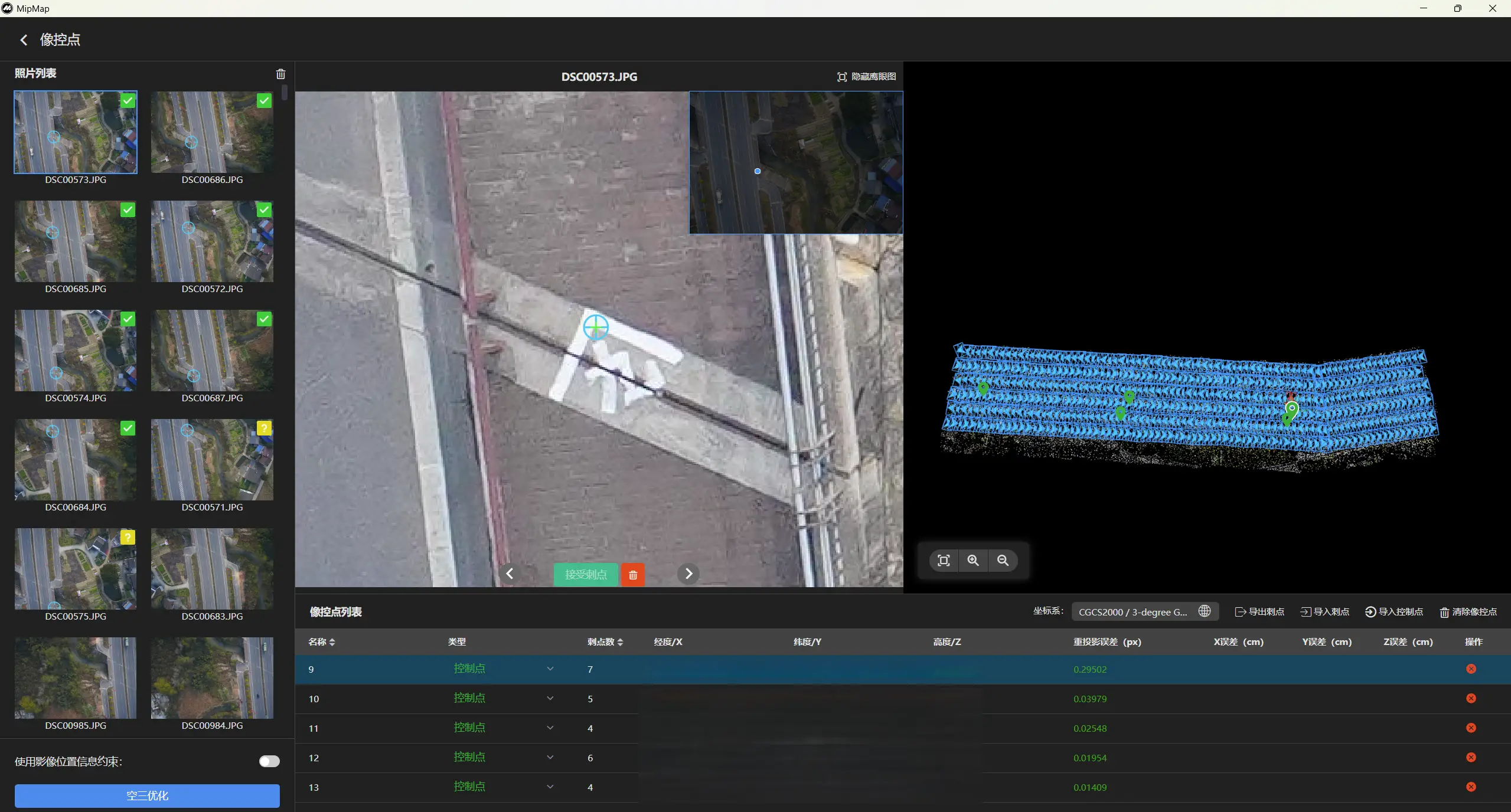 控制点刺点完毕后点击照片列表下方的"空三优化"按钮执行空三优化,执行完成后,像控点会显示每个像控点的重投影误差和XYZ方向的中误差。