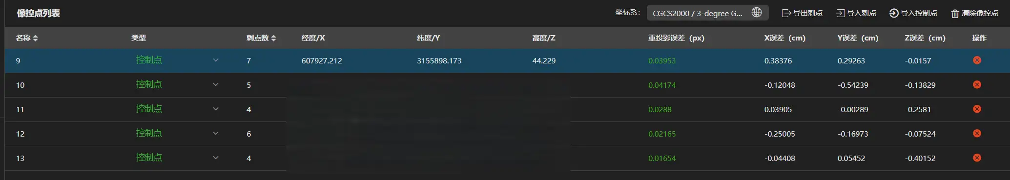 按钮可以删除单个控制点,点击面板右上角"清除像控点"按钮可以删除所有的控制点。