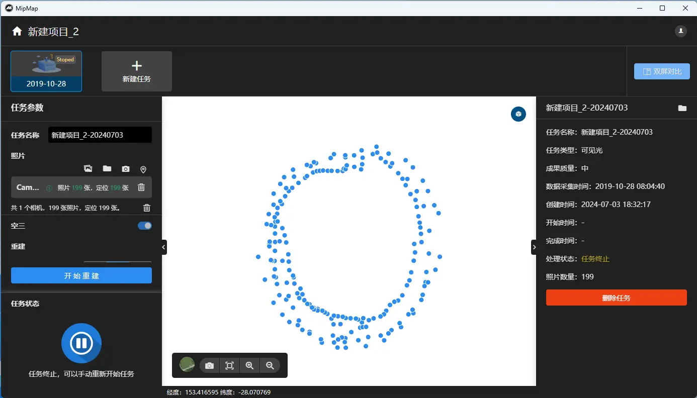 如果在任务正在处理或正在排队的时候点击"停止任务",任务会被终止。用户可以修改重建参数后点击"开始重建"来重新启动任务。